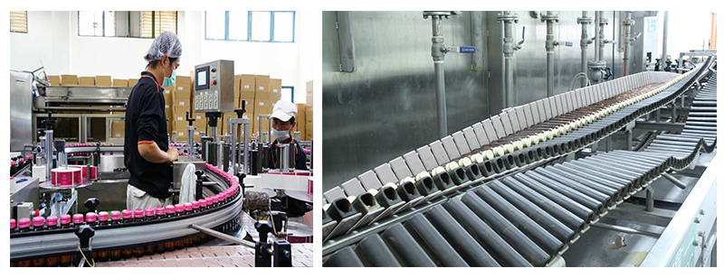 于100000級無塵室進行無菌配比,并經超高溫瞬間滅菌系統進行產品穩定化,運用全自動三級一體的充填封蓋系統結合臭氧純水,全程于無塵室進行高速充填,全面依據食品GMP規范進行生產。