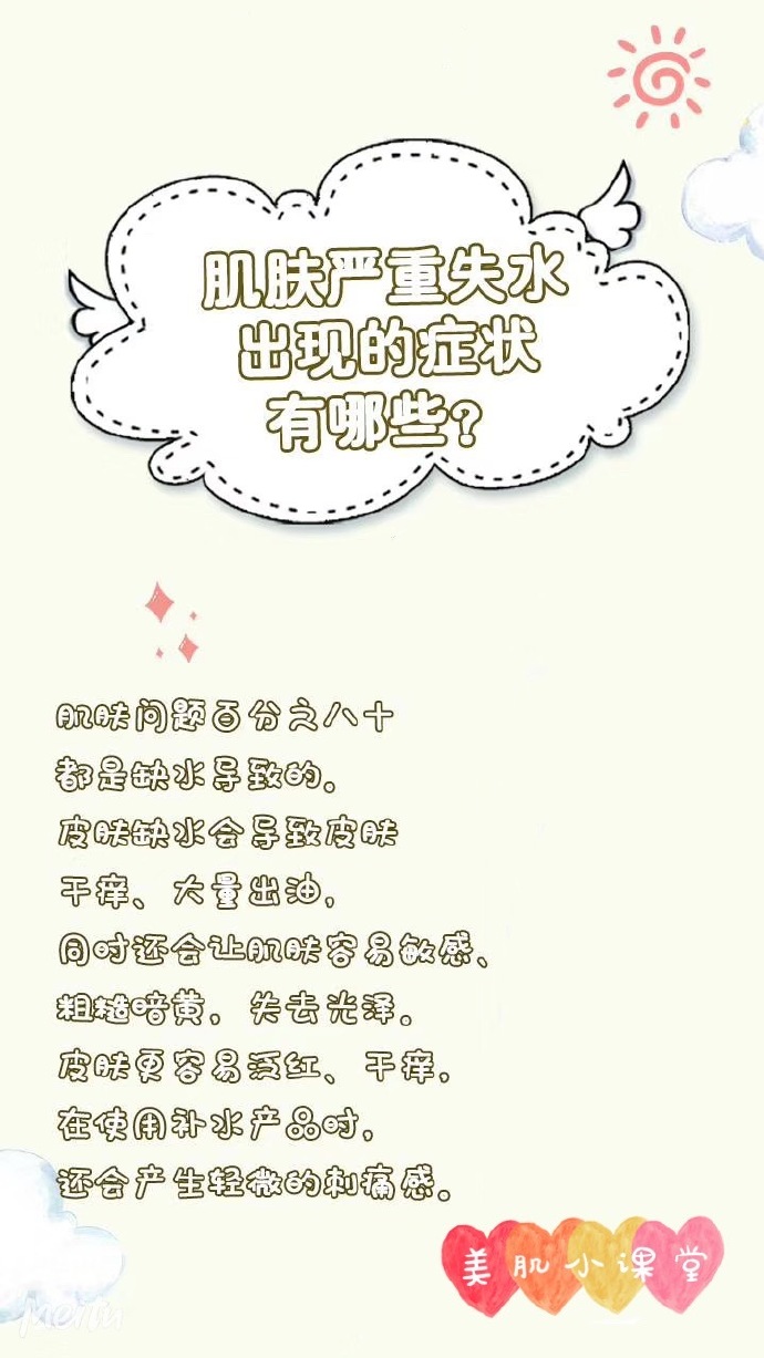 ??肌膚嚴重失水的癥狀有哪些? 要知道,我們的肌膚問題除了深層老化的不可逆外,其余百分之八十的問題都是由缺水導致的?? ?缺水會導致皮膚干癢,同時刺激大量出油,更容易造成毛孔堵塞,痘痘生成?? ?缺水會讓肌膚缺少水環境潤養,變得容易敏感、粗糙暗黃、失去光澤??